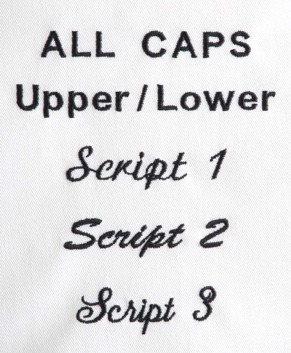 Below are the standard letter styles and thread colors available for your custom embroidery. Contact us for additional styles and colors.